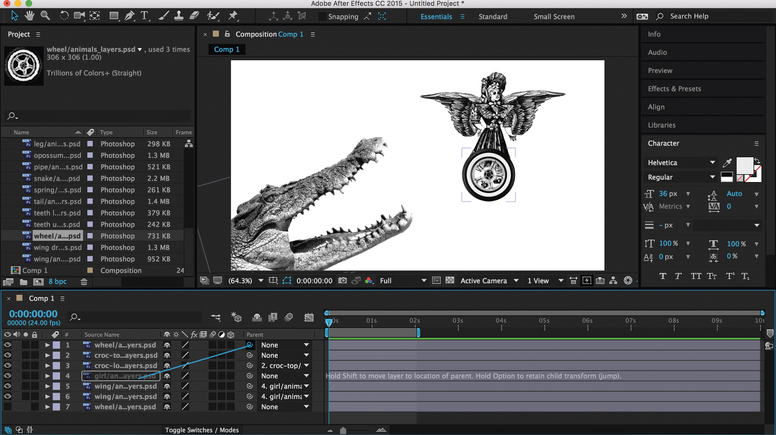 Parenting synchronises the changes of one layer with another layer’s transformation. The wheel of a car, for instance, would be the child layer of a vehicle’s body, which is the parent. In this case, every time the car is moved, rotated or scaled, the wheel goes with it.